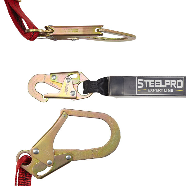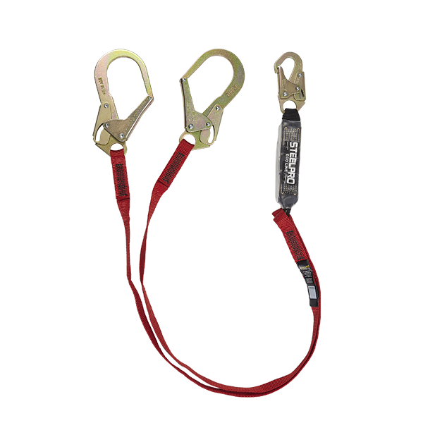 Eslinga Doble terminal "Y" en reata color Rojo para detención de caídas, con doble gancho estructurero de 2¼" de apertura y mosquetón de ¾"para conexión a la argolla dorsal.